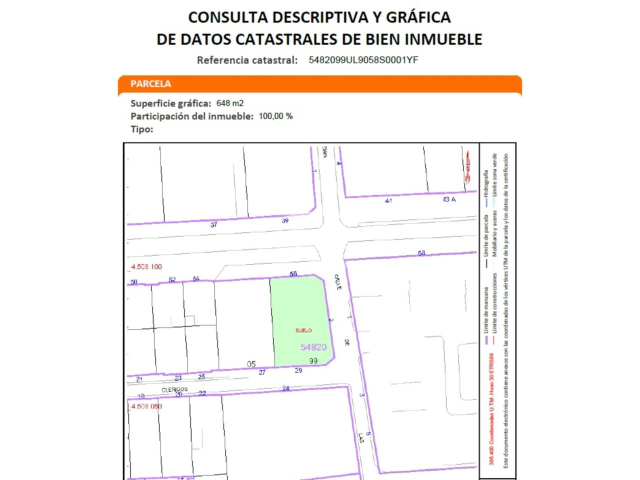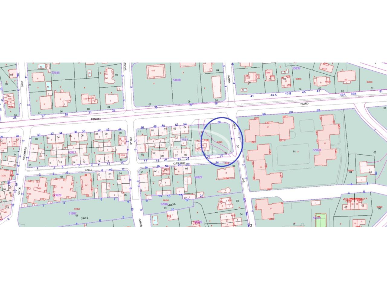 La parcela, con fachadas a 3 calles, de 20 metros a Pº Peñitas, 32 metros a Calle Peñitas y 22 metros a Calle Clérigos.